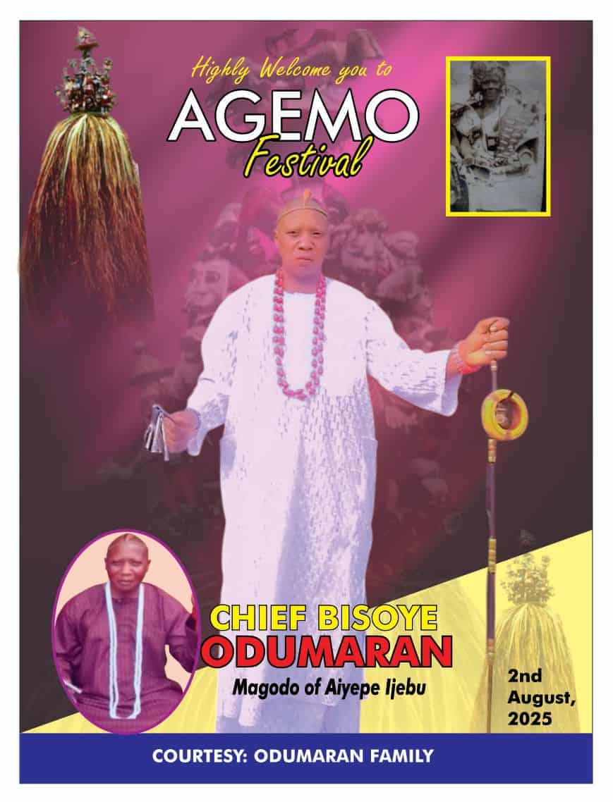 Events Happy Agemo Festival. Aseeyi Samodun oooooo by ifesowapo 10 August 2025 written by ifesowapo 10 August 2025 0 comments 219 Share 0 FacebookTwitterPinterestEmail ifesowapo previous post Happy Birthday, Omooba Saheed Goriola Jinadu next post Alhaja Queen Olufunke Taira Bello-Ladejobi You may also like Iyalode Abike Ladejobi 11 August 2025 Royal Union of Owu Progressive Women International Summit 6 August 2025 MY PROFOUND GRATITUDE ON CONTRIBUTIONS TOWARDS THE BORE-HOLE... 5 August 2025